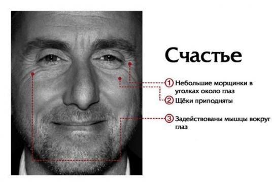 Счастье. Лоб и брови в состоянии покоя, нижние веки приподняты, но не напряжены. У внешних уголков глаз морщинки, называемые паучьими или гусиными лапками. Уголки губ оттянуты в стороны и приподняты.